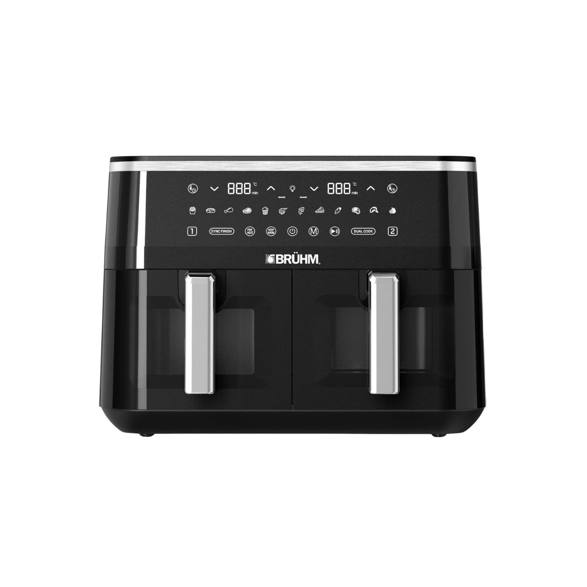BRUHM AIR FRYER 4.5+4.5L, 1600+1600W, TOUCH CONTROL DETACHED DRAWER WITH TRANSPARENT WINDOW, 60MINS TIMER PLASTIC HOUSING, BLACK & SILVER, BFE-903200B